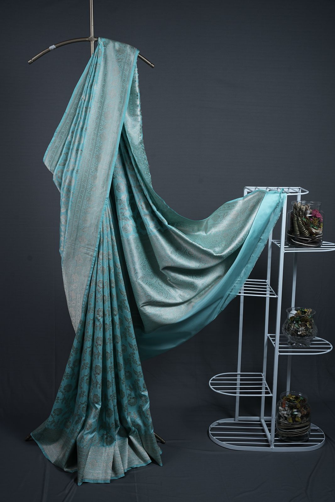 Experience the epitome of grace with this pale blue Banarasi Ektara silk saree, a masterpiece of complete handwoven artistry. Crafted with delicate silver zari work across the body, this saree radiates subtle sophistication, perfect for those who appreciate understated luxury. The richly woven pallu adds a regal touch, making it an ideal choice for weddings, festive occasions, and grand celebrations. Light, elegant, and effortlessly timeless, this saree is a must-have for your ethnic collection. Shop now and embrace the beauty of Banarasi craftsmanship