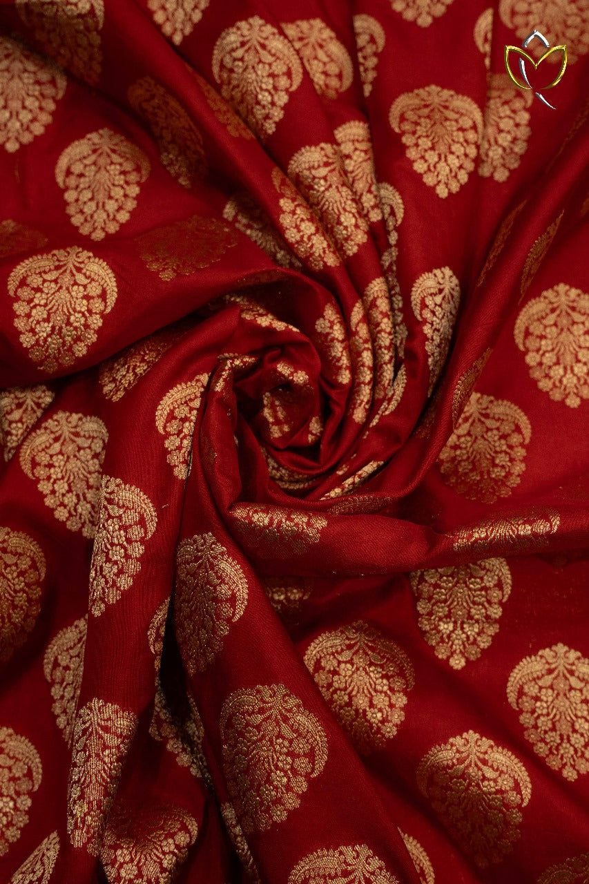 Drape yourself in the grandeur of this Dark Red Banarasi Pattu Saree, a stunning creation of traditional handloom craftsmanship. The body features intricate traditional motifs woven with exquisite golden zari, adding a touch of regal charm. Its rich and elegant pallu enhances the saree's luxurious appeal, while the plain blouse offers a perfect balance to the ornate design. Ideal for weddings, festive celebrations, and special occasions, this saree is a timeless blend of heritage and sophistication, making it an essential addition to your collection.