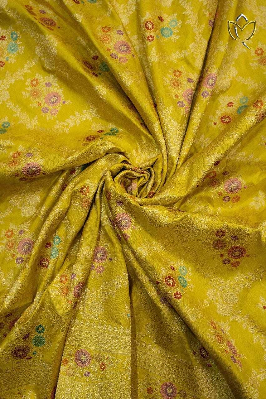 Celebrate timeless beauty with this Mustard Yellow Banarasi Pattu Saree, a true masterpiece of traditional handwoven artistry. Featuring an all-over Kaduva Jaal design, woven with pure zari, the saree exudes rich texture and elegance. The trendy border and turning weaving add a contemporary flair to its classic charm. Crafted with precision, this heavy, rich saree is perfect for weddings, festive occasions, and grand celebrations, making it a striking addition to your wardrobe that radiates luxury and sophistication.
