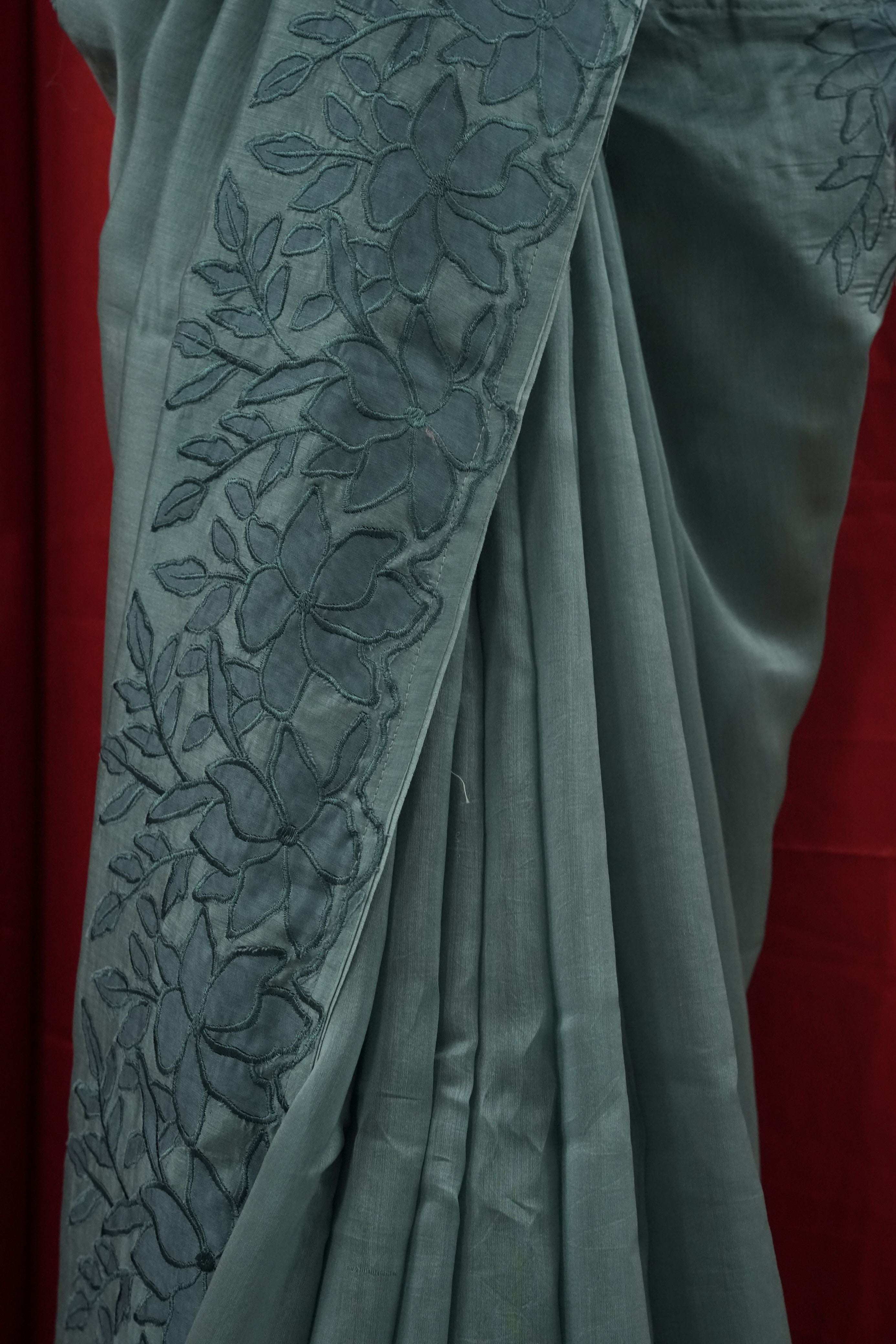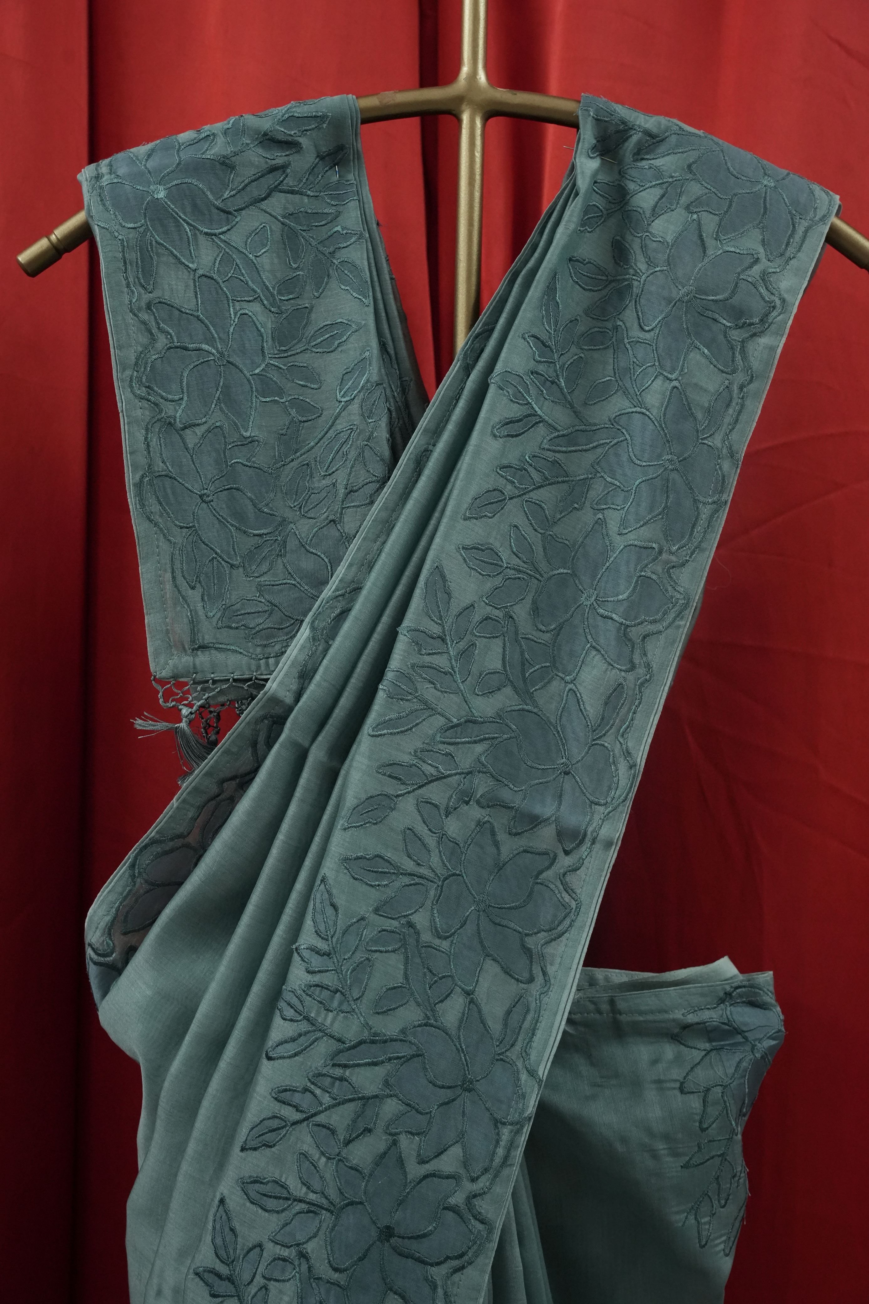 Exude charm and sophistication with this elegant teal blue Chanderi Applique Work saree, designed for the woman who appreciates timeless elegance and modern finesse. Crafted from premium chanderi fabric, this saree features a soft, sheer texture that drapes gracefully, creating an effortlessly refined silhouette.
