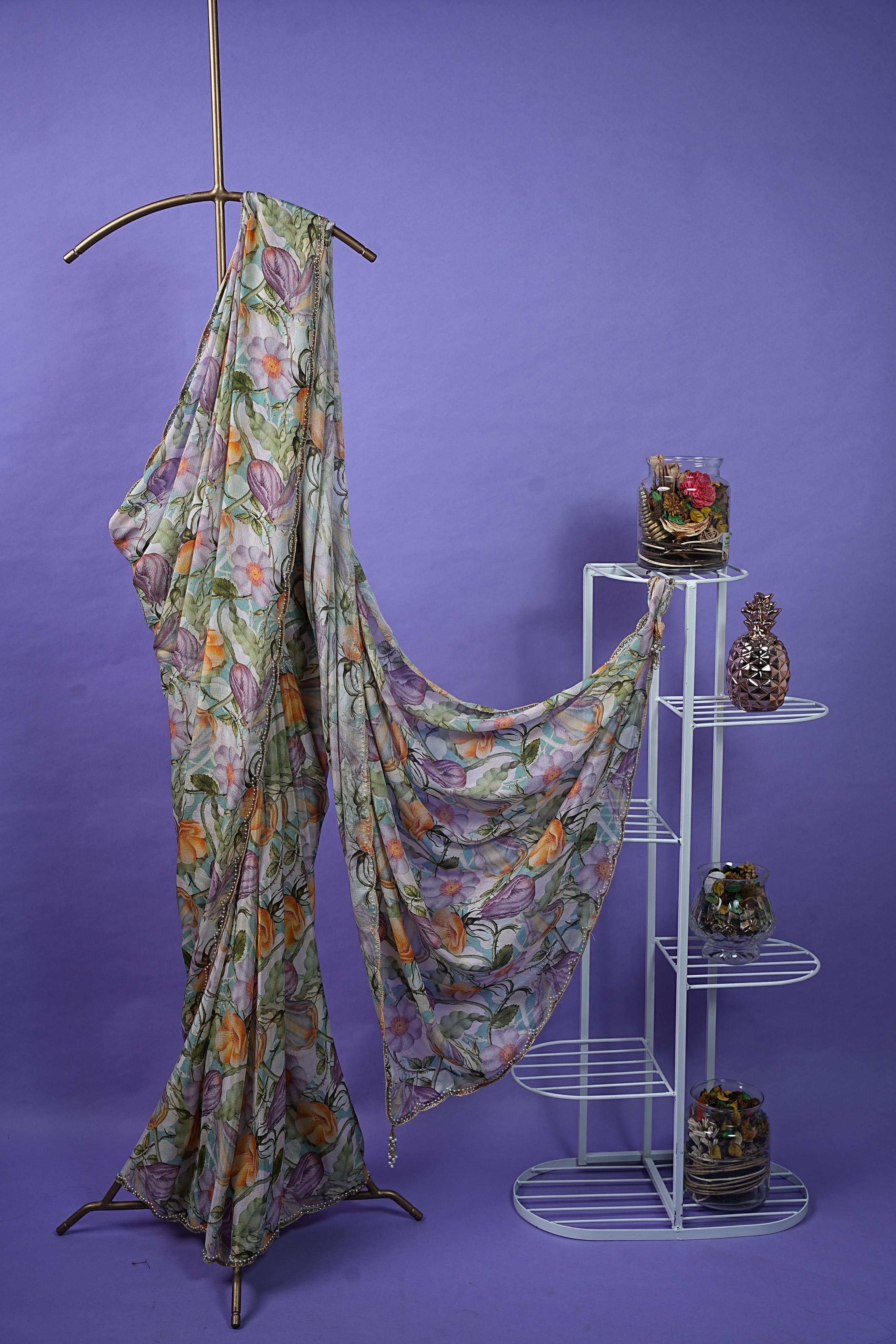 Step into elegance with our lilac chiffon saree, adorned with an all-over floral design that exudes charm and femininity. This stunning saree features a handwork border, adding a touch of sophistication to its simple yet graceful silhouette. Paired with a stitched blouse, it combines ease and style, making it perfect for parties and special occasions. The lightweight chiffon fabric drapes beautifully, ensuring you stay comfortable while looking effortlessly chic. This saree is an ideal choice for those who want to make a fashionable statement at any event.