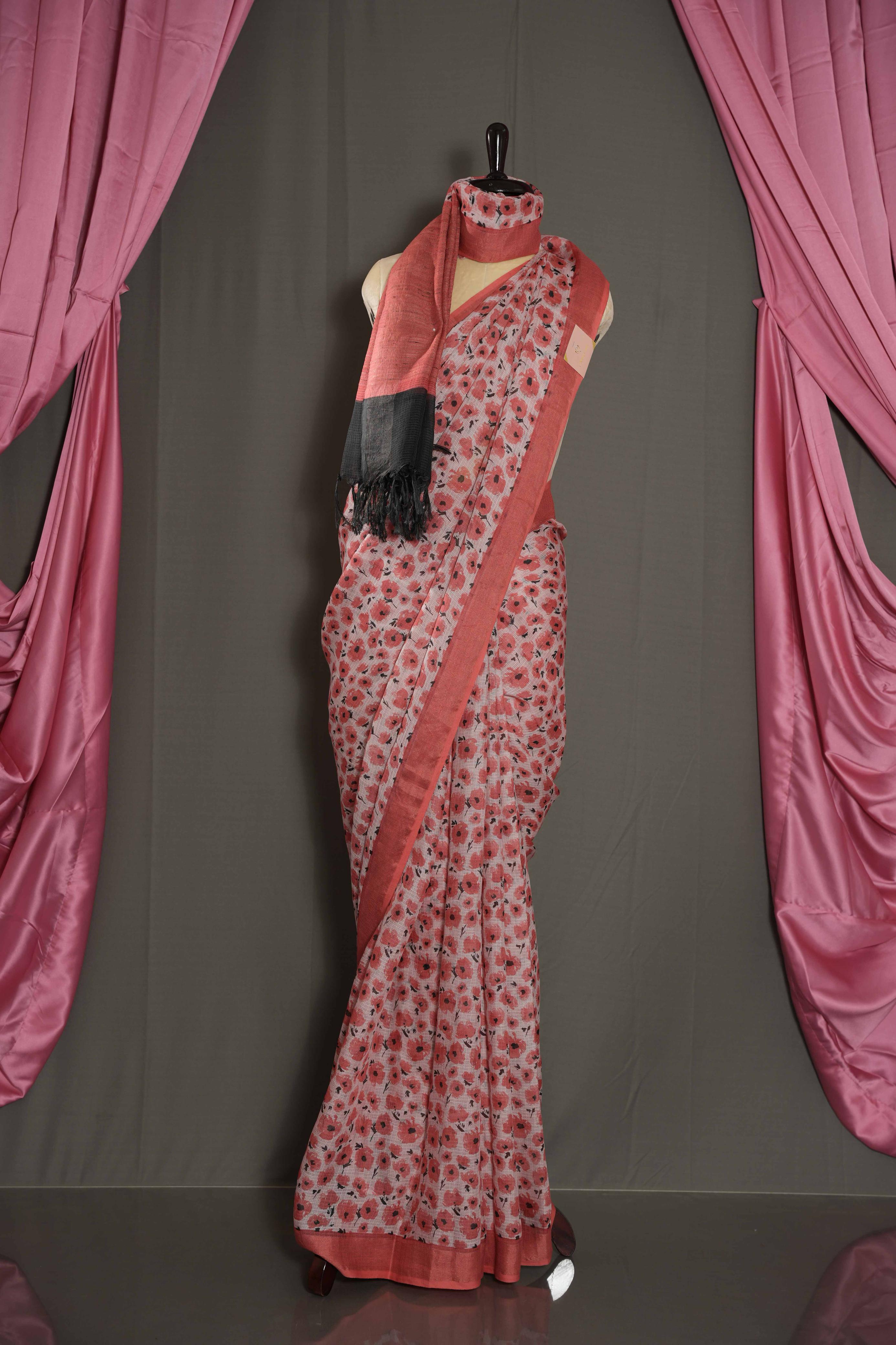 Delicate and graceful, this Baby Pink Cotton Kota saree is adorned with all-over floral designs that bring a soft, feminine charm to its airy, lightweight texture. The saree is beautifully finished with a rich gold zari border, adding a touch of elegance and festive appeal. The jute pallu enhances its natural, earthy vibe, making this saree a perfect choice for daytime events, festive occasions, and cultural gatherings where tradition meets simplicity.