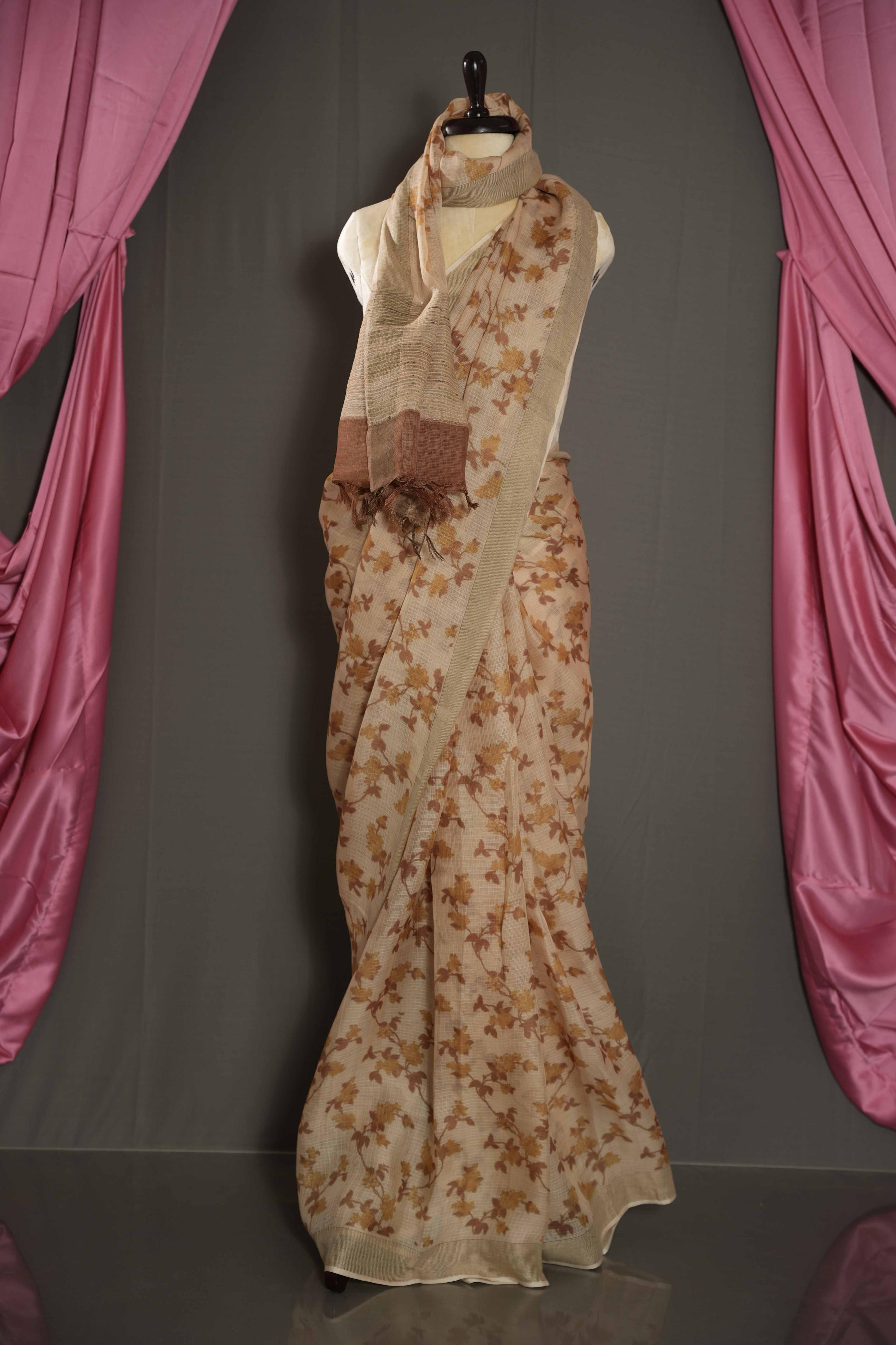 This Beige Cotton Kota saree exudes effortless charm with its all-over floral design, creating a graceful and feminine appeal. The saree is enhanced with a subtle yet rich gold zari border, giving it a sophisticated touch. The jute pallu adds a natural texture, perfectly blending tradition with earthy elegance. Ideal for casual celebrations, cultural gatherings, and festive occasions, this saree offers a timeless, lightweight drape that’s both comfortable and stylish
