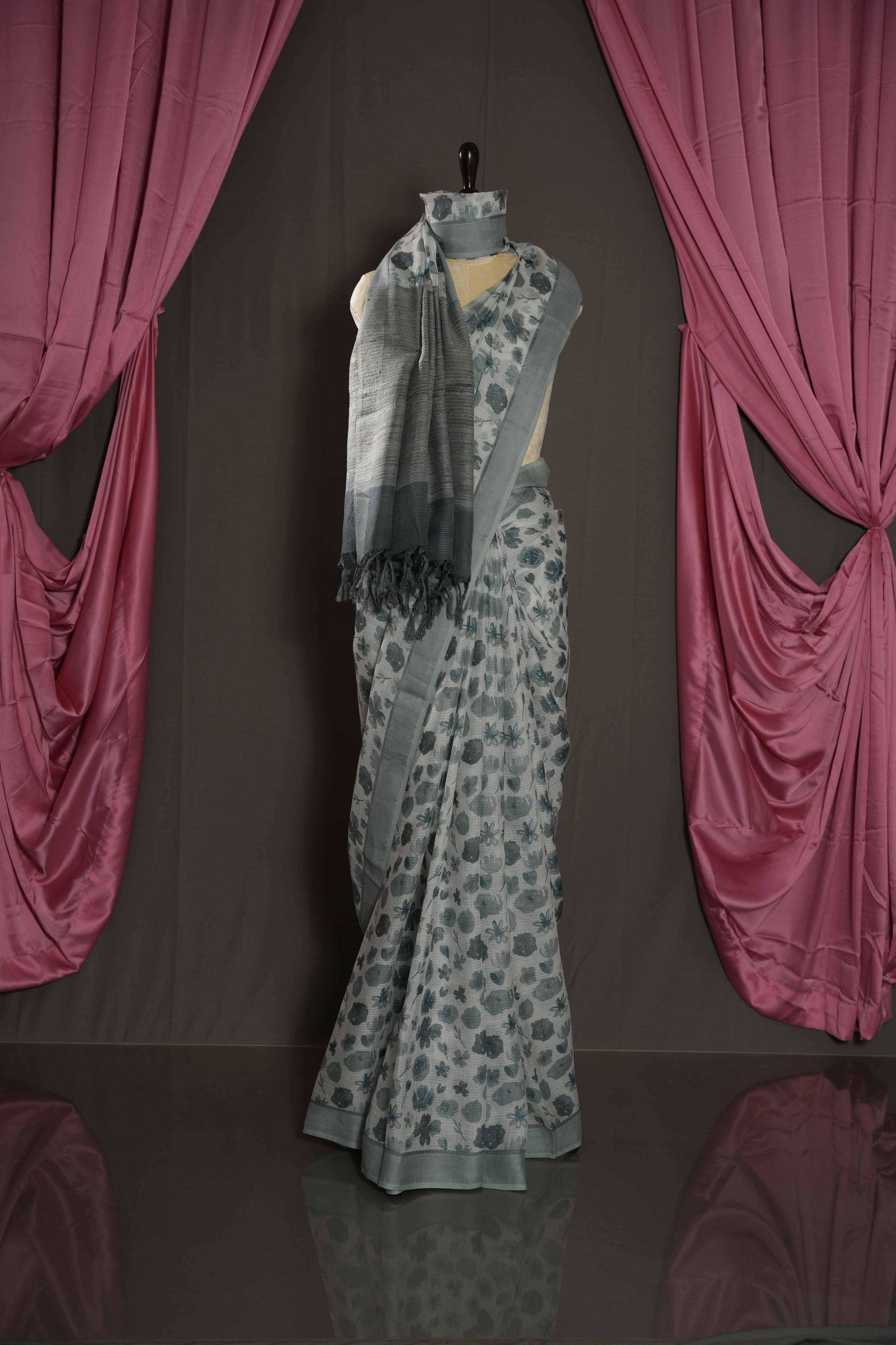 Embrace effortless elegance with this beautiful Half White Handloom Kota saree, featuring delicate all-over floral designs that add grace and charm to its lightweight drape. The saree is enhanced with a shimmering gold zari border, giving it a subtle festive glow. Finished with a textured jute pallu, this saree perfectly blends tradition with natural elegance, making it an ideal choice for festive occasions, cultural events, and casual celebrations.