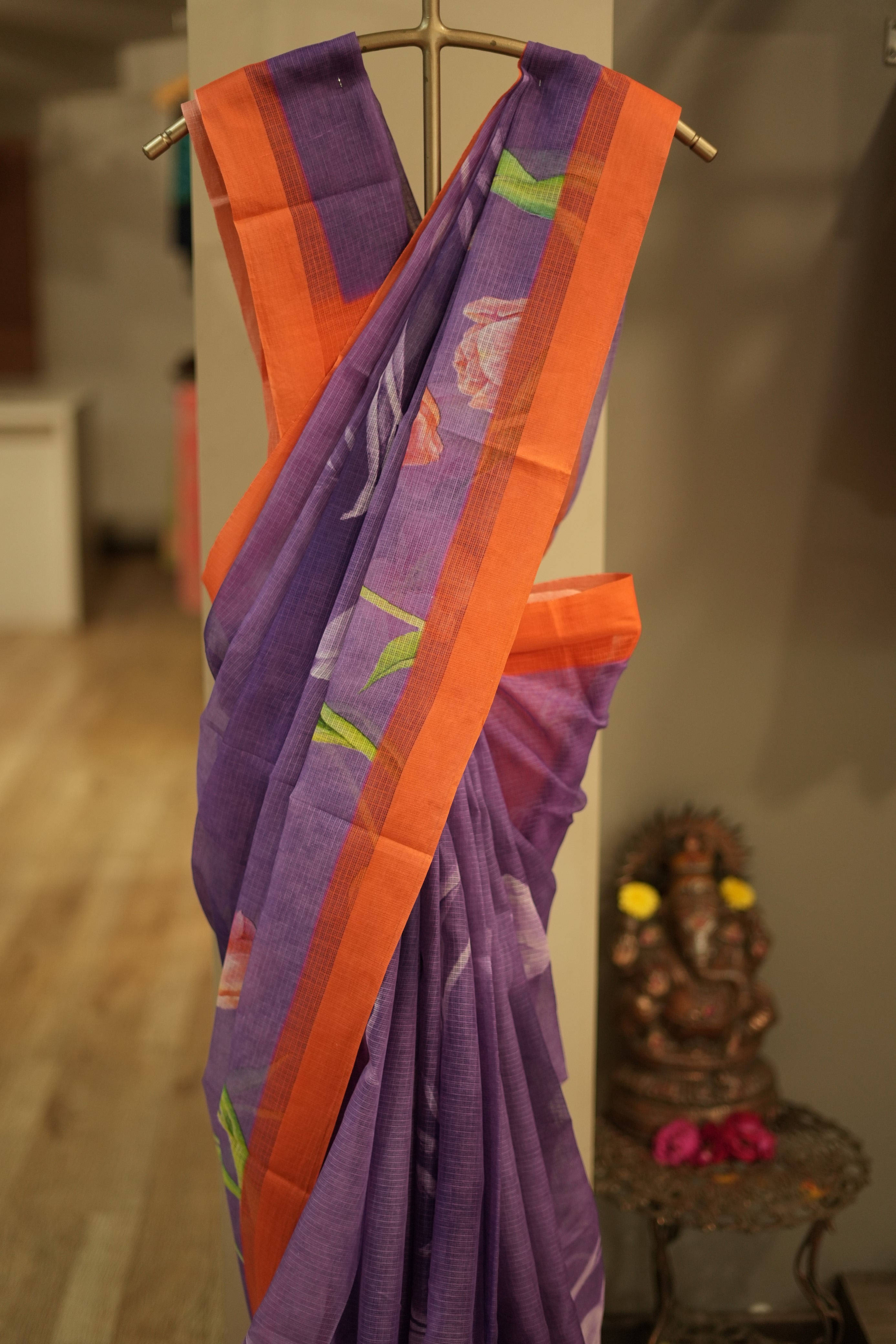 Embrace elegance with this stunning lavender Cotton Kota saree, featuring a delicate floral print and a vibrant orange border. The soft linen fabric offers a perfect blend of comfort and sophistication, making it ideal for both casual gatherings and festive occasions. The saree’s lightweight texture drapes gracefully, enhancing your natural poise with a contemporary yet traditional touch.