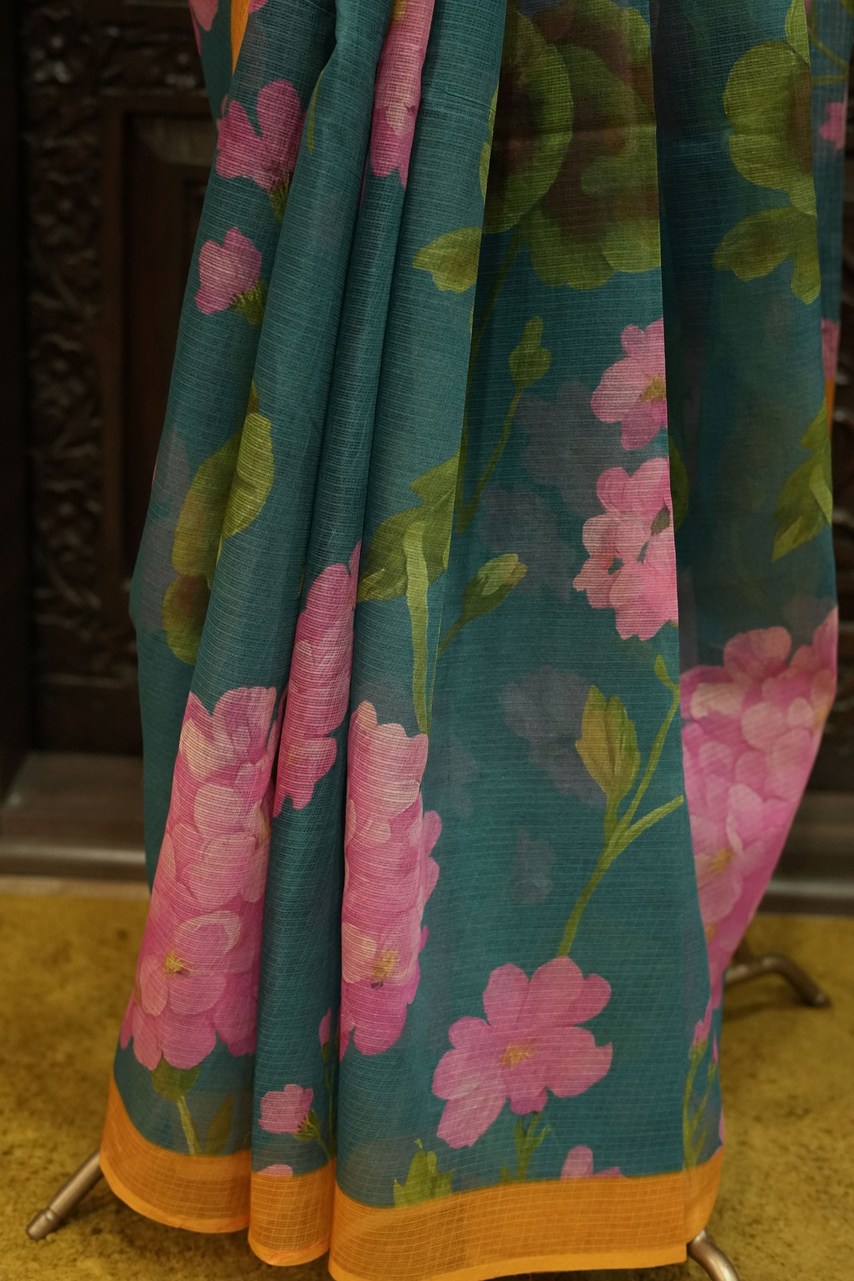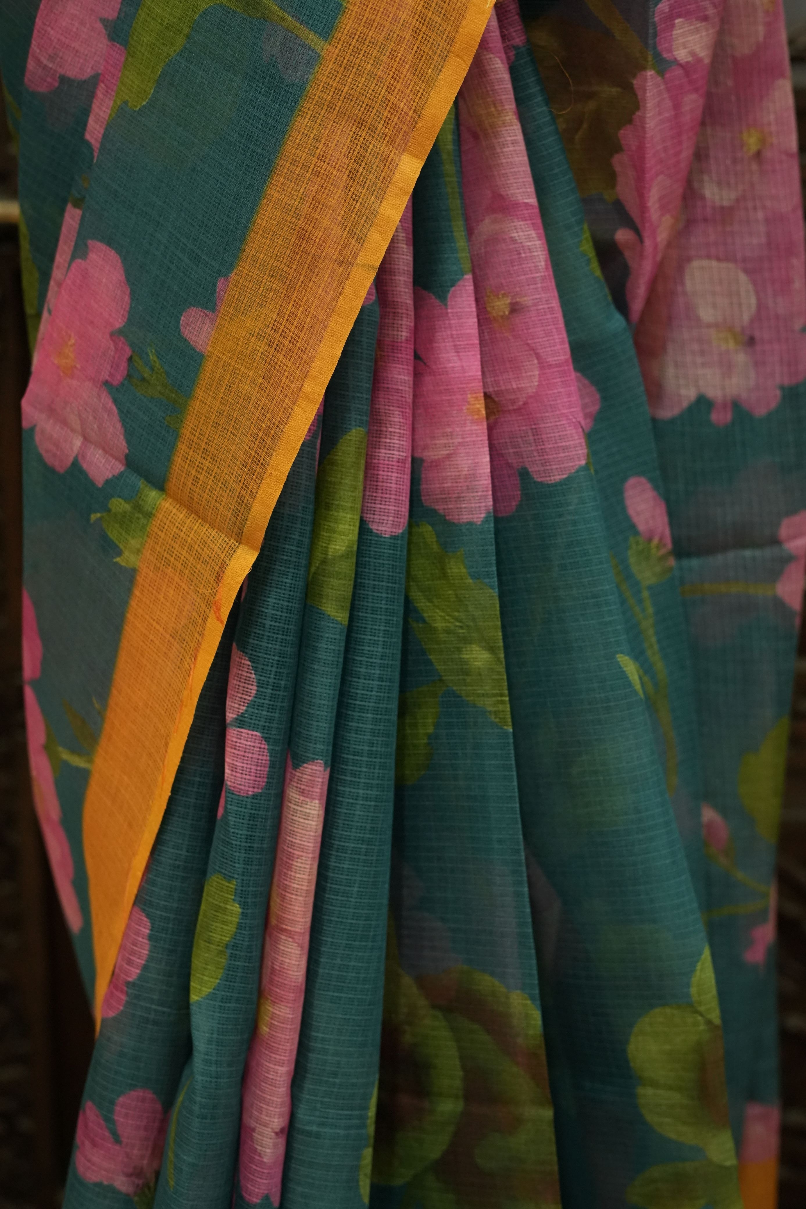 Add a splash of color and charm to your wardrobe with this teal Cotton Kota saree featuring vibrant pink floral prints and a striking mustard yellow border. Crafted from soft, breathable Cotton Kota, this saree drapes effortlessly and exudes contemporary grace with traditional artistry. The combination of vivid hues and delicate florals makes it an ideal choice for festive gatherings, daytime events, or casual outings.