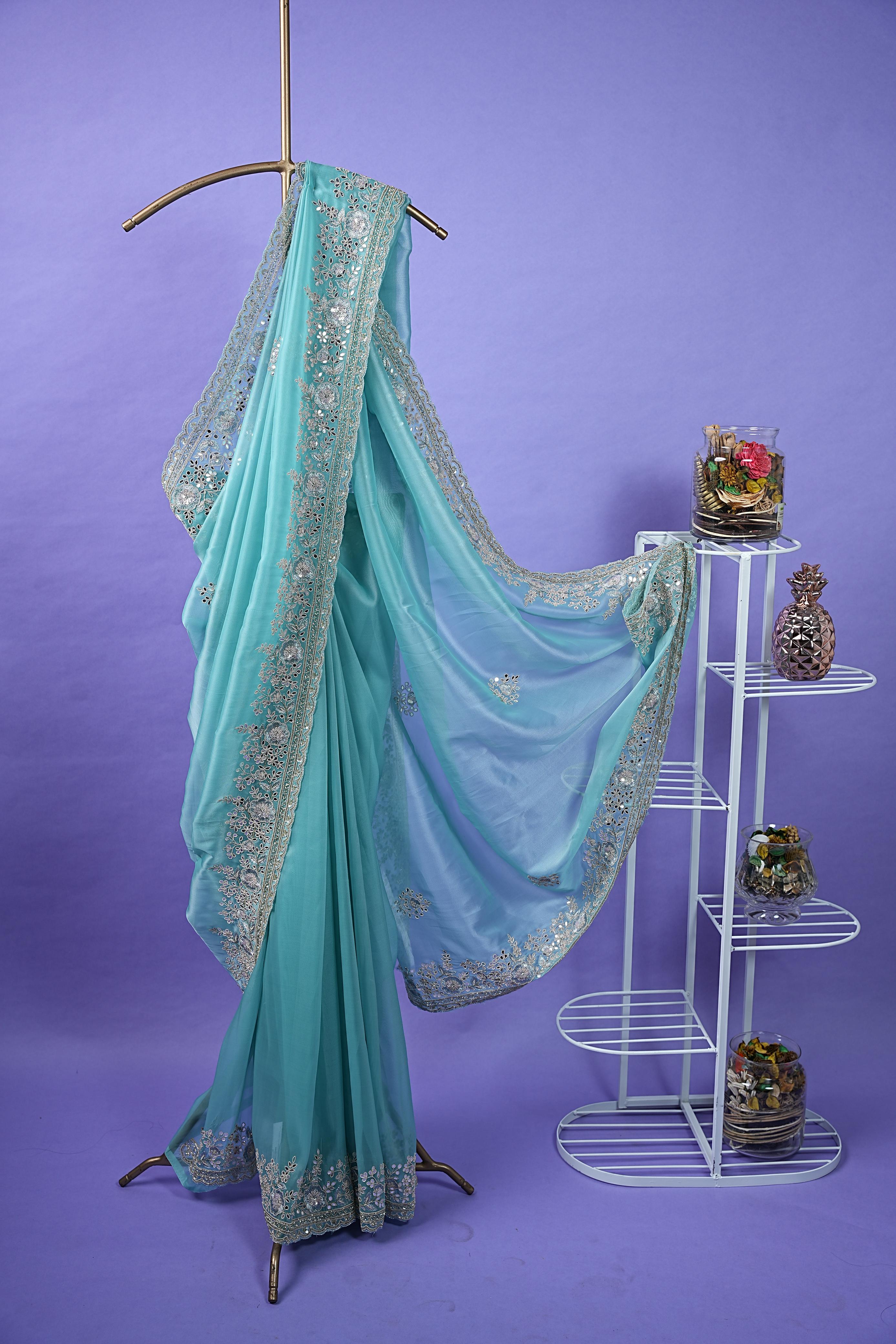 Fancy Baby Blue Glosco Tissue Organza Saree with Hand Embroidery Border