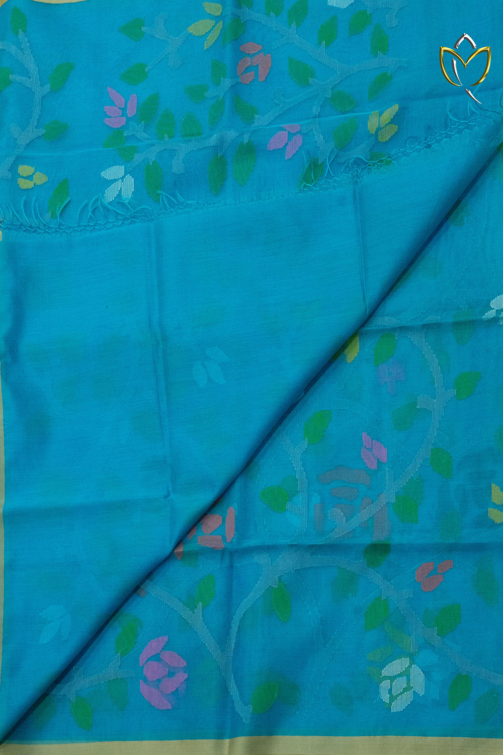 Add a splash of color to your ethnic collection with our Muslin Jamdani saree in vibrant turquoise blue. The saree features all-over creper Jamdani weaving, which creates a stunning visual texture that captivates the eye. Enhanced by elegant zari borders on both sides, this piece exudes sophistication and charm. With a self-pallu and self-blouse, it offers a cohesive and stylish look. Handwoven with precision, this lightweight saree is skin-soothing and drapes beautifully, making it perfect for any occasion. Celebrate the artistry of handloom craftsmanship with this exquisite masterpiece that embodies elegance and grace.