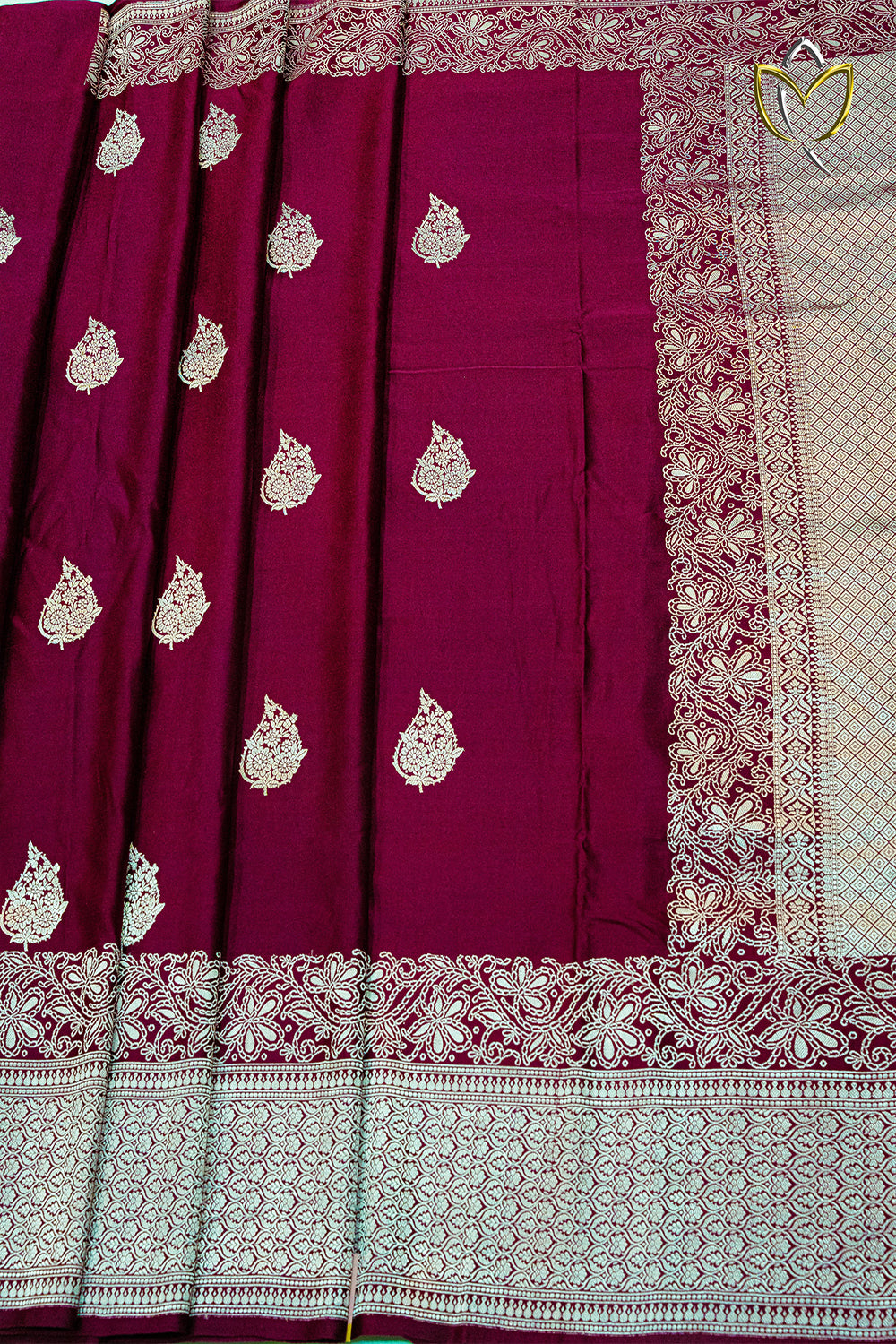 Elevate your elegance with this exquisite Pure Banarasi Malai Silk Saree, adorned with a shimmering silver jari cripper border. This handwoven masterpiece in a rich, bright maroon color radiates timeless grace, perfect for any grand occasion. The intricate craftsmanship and luxurious texture of the saree make it a cherished addition to your wardrobe, embodying the heritage of Banarasi artistry.