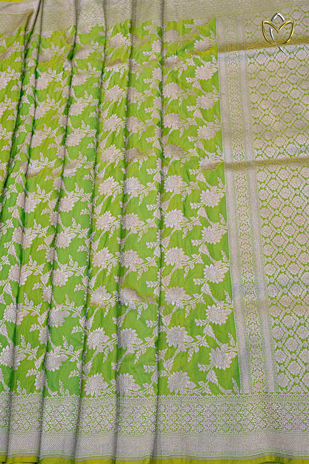 Stunning Pure Banarasi Green Double Tone Saree featuring an allover Jaal design, crafted with intricate precision. The saree is adorned with an elegant border and a rich pallu, exuding timeless elegance. Handwoven to perfection, this masterpiece is ideal for special occasions, offering a luxurious blend of tradition and sophistication.