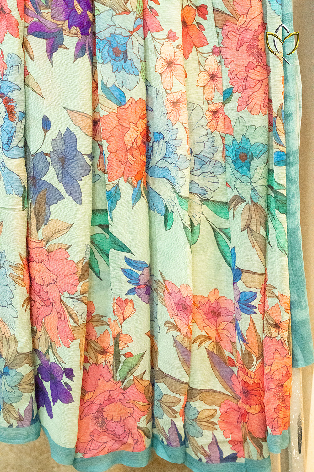 Refresh your style with our Pure Chiffon Saree in a calming mint color. This saree features an elegant all-over contrast floral design, offering a beautiful blend of soft colors and vibrant floral patterns. Made from lightweight chiffon, it is perfect for all-day wear, providing comfort without compromising on style. The airy fabric drapes effortlessly, giving you a graceful look for any occasion. Whether you're attending a casual gathering or a festive event, this saree brings a touch of sophistication and freshness to your wardrobe.
