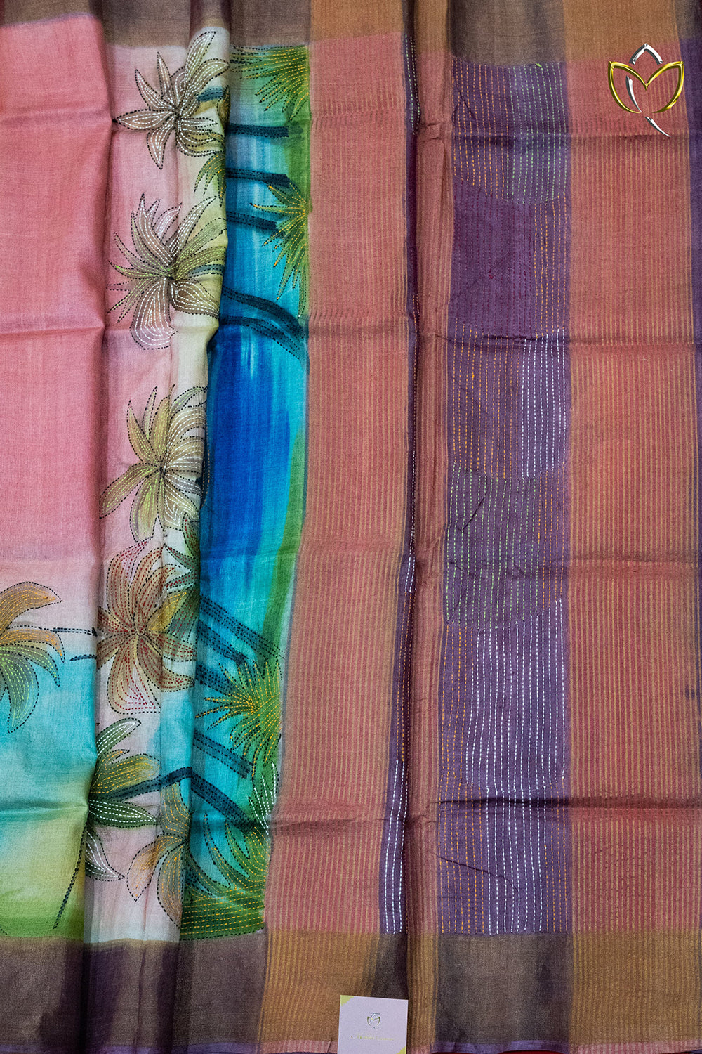 Discover the charm of our Pure Tussar saree in a delightful peach hue. This handwoven, lightweight saree is beautifully hand-painted, featuring intricate designs outlined with Kantha work and accented by a lustrous zari border. The contrast border and pallu add a striking element to its design, making it a perfect choice for special occasions or festive celebrations. Embrace elegance and tradition with this exquisite saree that combines artistry and comfort seamlessly.