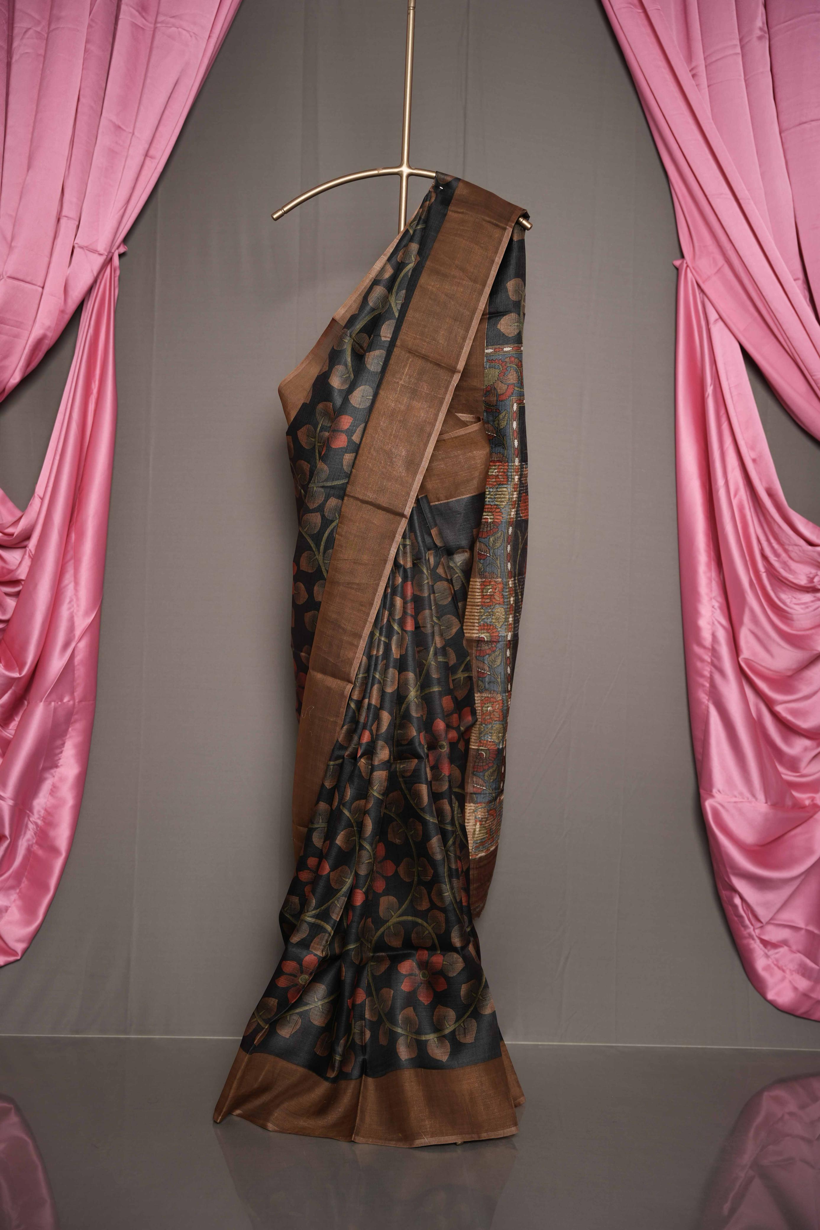 This Navy Blue Tussar saree features a stunning all-over Kalamkari print, showcasing traditional artistry and intricate design. The border is accented with antique gold, adding a rich and timeless appeal to the saree. The lightweight fabric ensures comfort, while the big pallu enhances the overall elegance, making it perfect for weddings, festive occasions, and cultural gatherings. This saree offers a perfect blend of heritage and modern sophistication, making it a must-have for any saree lover.