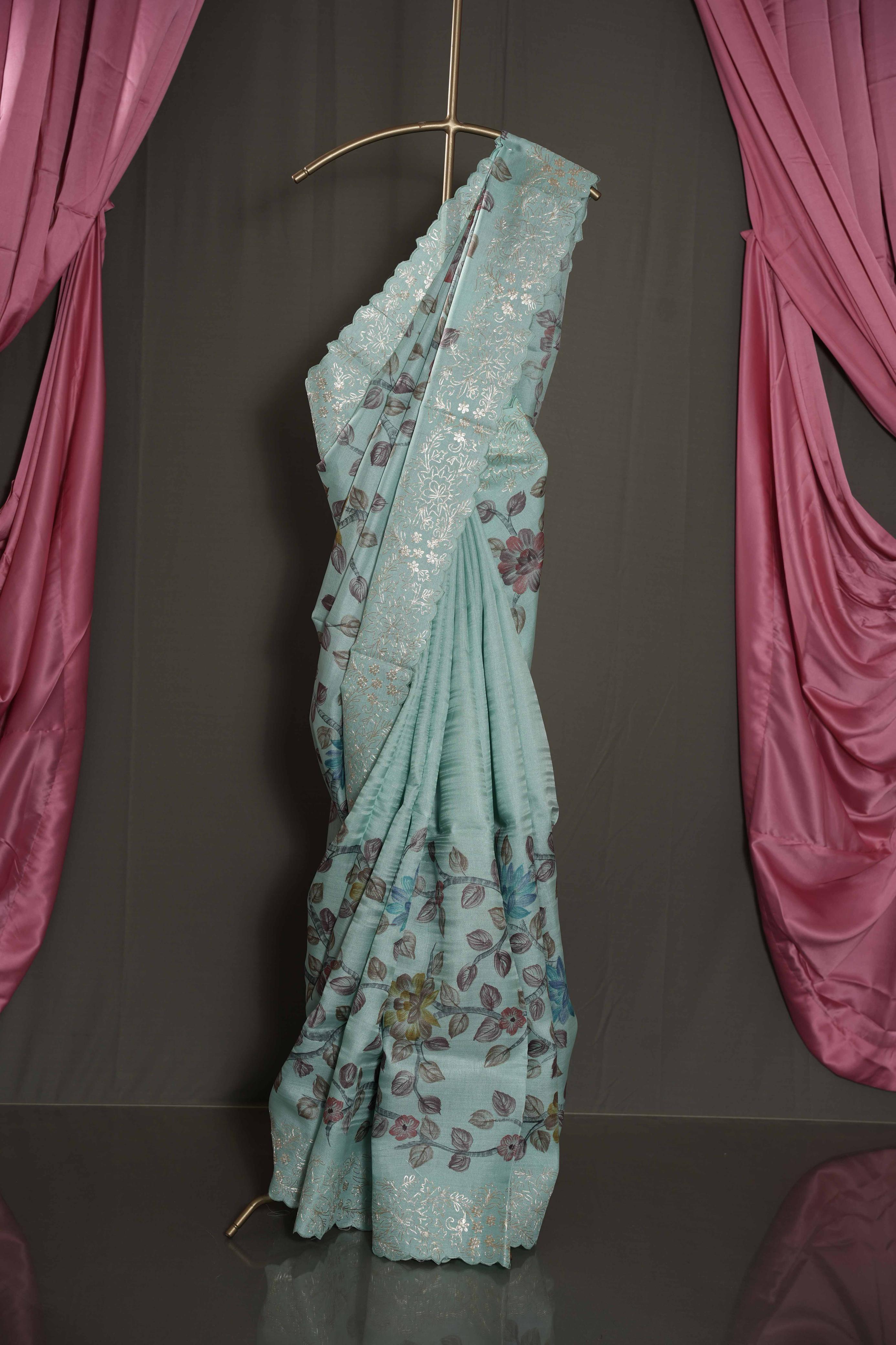 Step into elegance with this stunning Sky Blue Tussar Silk saree, featuring delicate floral designs that enhance its graceful look. The saree is adorned with a shimmering silver zari border, adding a subtle touch of luxury. Completing the design is an intricate cut work border, blending traditional artistry with contemporary style. Perfect for festive occasions, weddings, and special gatherings, this saree offers a lightweight drape and timeless sophistication for the modern woman