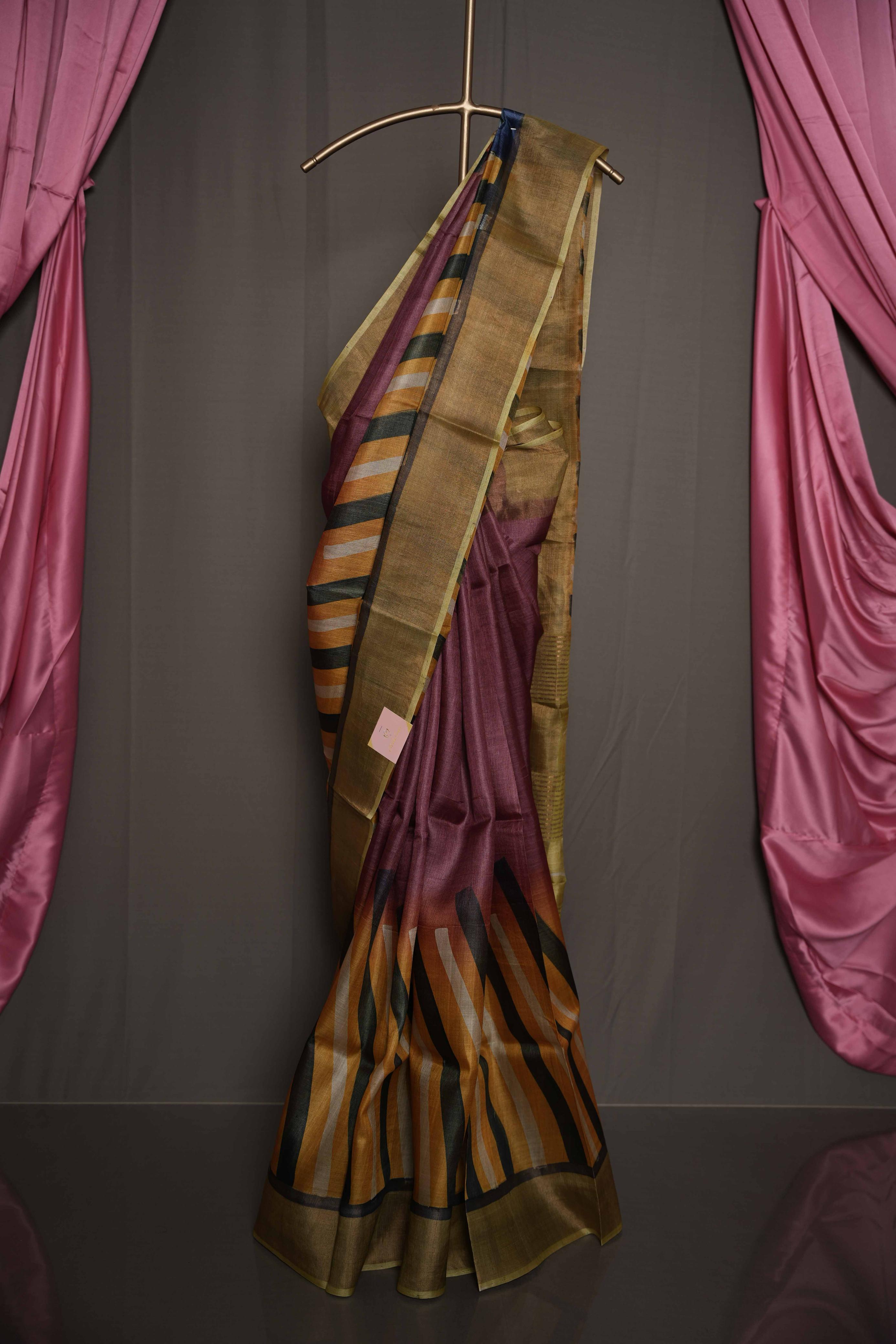 This Wine Dregs Tussar saree offers a sophisticated, timeless appeal with its plain self-color body, allowing the rich texture of the Tussar fabric to shine through. The half-line border design adds a modern touch, while the antique gold border brings a traditional charm to the saree. Perfect for evening events, weddings, and cultural celebrations, this saree combines subtle elegance with a luxurious finish, making it a must-have for any wardrobe.